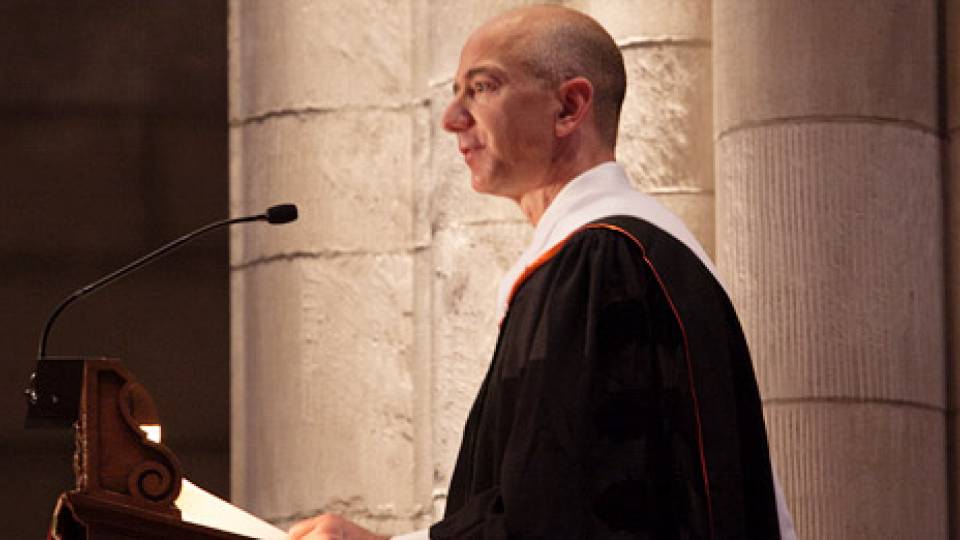 I got the idea to start Amazon 16 years ago. I came across the fact that Web usage was growing at 2,300 percent per year. I'd never seen or heard of anything that grew that fast, and the idea of building an online bookstore with millions of titles -- something that simply couldn't exist in the physical world -- was very exciting to me. I had just turned 30 years old, and I'd been married for a year. I told my wife MacKenzie that I wanted to quit my job and go do this crazy thing that probably wouldn't work since most startups don't, and I wasn't sure what would happen after that. MacKenzie (also a Princeton grad and sitting here in the second row) told me I should go for it. As a young boy, I'd been a garage inventor. I'd invented an automatic gate closer out of cement-filled tires, a solar cooker that didn't work very well out of an umbrella and tinfoil, baking-pan alarms to entrap my siblings. I'd always wanted to be an inventor, and she wanted me to follow my passion.